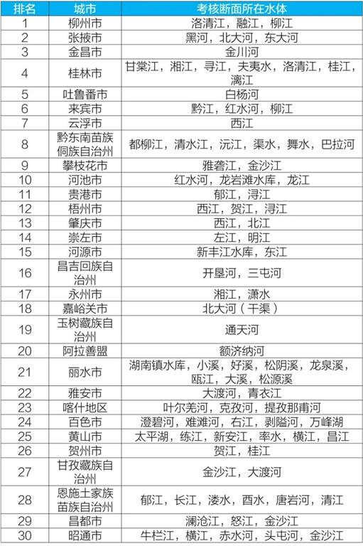 參加排名的全國地級及以上城市,覆蓋2050個國控斷面(其中1940個為國家地表水考核斷面,110個為入??刂茢嗝妫?。2020年10月,全國地級及以上城市中,桂林、柳州和吐魯番等30個城市國家地表水考核斷面水環(huán)境質(zhì)量相對較好(從第1名至第30名),滄州、商丘和聊城等30個城市國家地表水考核斷面水環(huán)境質(zhì)量相對較差(從倒數(shù)第1名至倒數(shù)第30名);2020年1-10月,全國地級及以上城市中,柳州、張掖和金昌等30個城市國家地表水考核斷面水環(huán)境質(zhì)量相對較好(從第1名至第30名),銅川、滄州和邢臺等30個城市國家地表水考核斷面水環(huán)境質(zhì)量相對較差(從倒數(shù)第1名至倒數(shù)第30名)。詳細(xì)見附表1~附表4。
