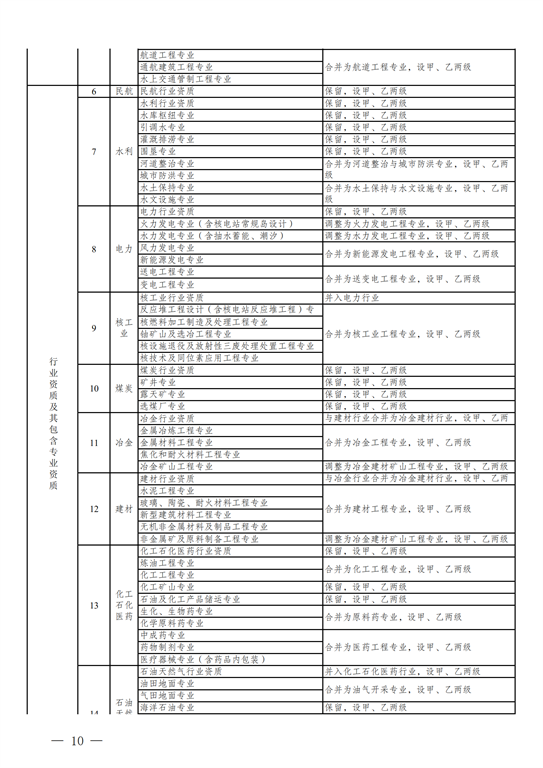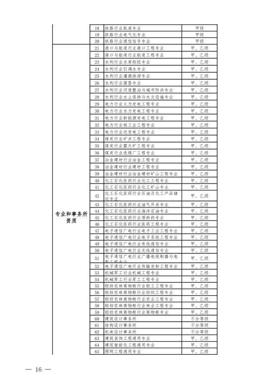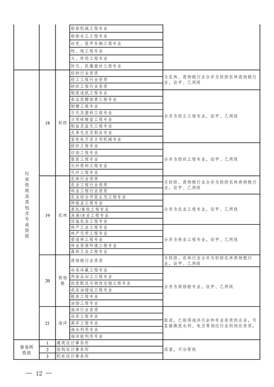 2.工程設(shè)計資質(zhì)。保留綜合資質(zhì);將21類行業(yè)資質(zhì)整合為14類行業(yè)資質(zhì);將151類專業(yè)資質(zhì)、8類專項資質(zhì)、3類事務(wù)所資質(zhì)整合為70類專業(yè)和事務(wù)所資質(zhì)。綜合資質(zhì)、事務(wù)所資質(zhì)不分等級;行業(yè)資質(zhì)、專業(yè)資質(zhì)等級原則上壓減為甲、乙兩級(部分資質(zhì)只設(shè)甲級)。