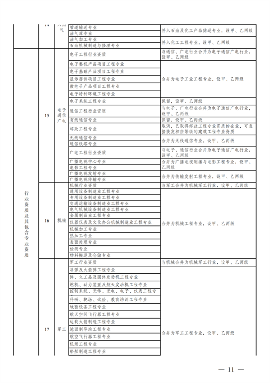 3.施工資質(zhì)。將10類施工總承包企業(yè)特級資質(zhì)調(diào)整為施工綜合資質(zhì),可承擔各行業(yè)、各等級施工總承包業(yè)務(wù);保留12類施工總承包資質(zhì),將民航工程的專業(yè)承包資質(zhì)整合為施工總承包資質(zhì);將36類專業(yè)承包資質(zhì)整合為18類;將施工勞務(wù)企業(yè)資質(zhì)改為專業(yè)作業(yè)資質(zhì),由審批制改為備案制。綜合資質(zhì)和專業(yè)作業(yè)資質(zhì)不分等級;施工總承包資質(zhì)、專業(yè)承包資質(zhì)等級原則上壓減為甲、乙兩級(部分專業(yè)承包資質(zhì)不分等級),其中,施工總承包甲級資質(zhì)在本行業(yè)內(nèi)承攬業(yè)務(wù)規(guī)模不受限制。