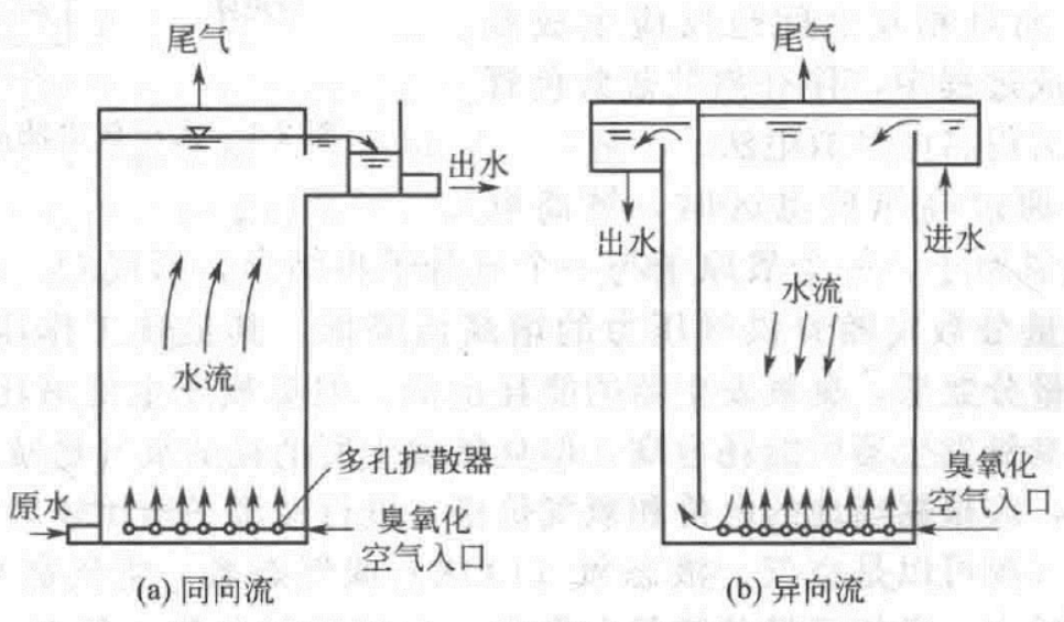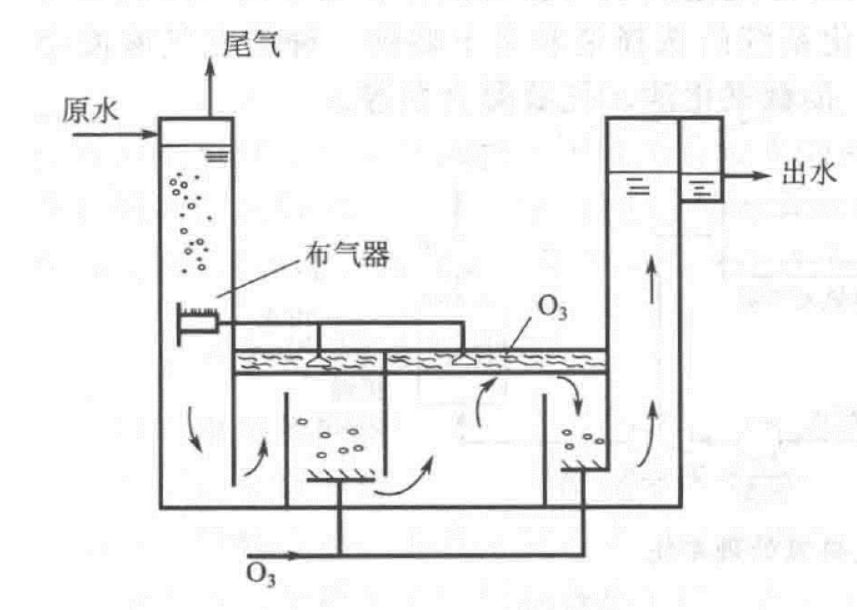 當(dāng)原水污染較輕或只是氧化鐵、錳時(shí),可用單格接觸氧化池。池底部設(shè)置多孔擴(kuò)散布?xì)馄?,將臭氧化空氣分散為?xì)氣泡,接觸時(shí)間為4min以上。