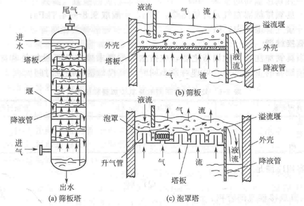 如上圖所示,塔內(nèi)每50-70mm設(shè)一層塔板,每層塔上設(shè)溢流堰和降液管,液體在塔板上翻過溢流堰,經(jīng)降液管流到下層塔板。